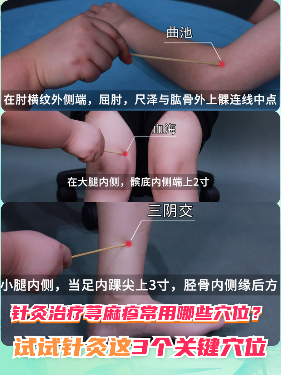 三陰交:位于小腿內(nèi)側(cè),內(nèi)踝尖上三寸。該穴位為肝、脾、腎三條陰經(jīng)交匯之處,針刺三陰交可滋陰養(yǎng)血、祛濕止癢,尤其適合慢性蕁麻疹患者,從整體上改善體質(zhì),降低復(fù)發(fā)幾率??。