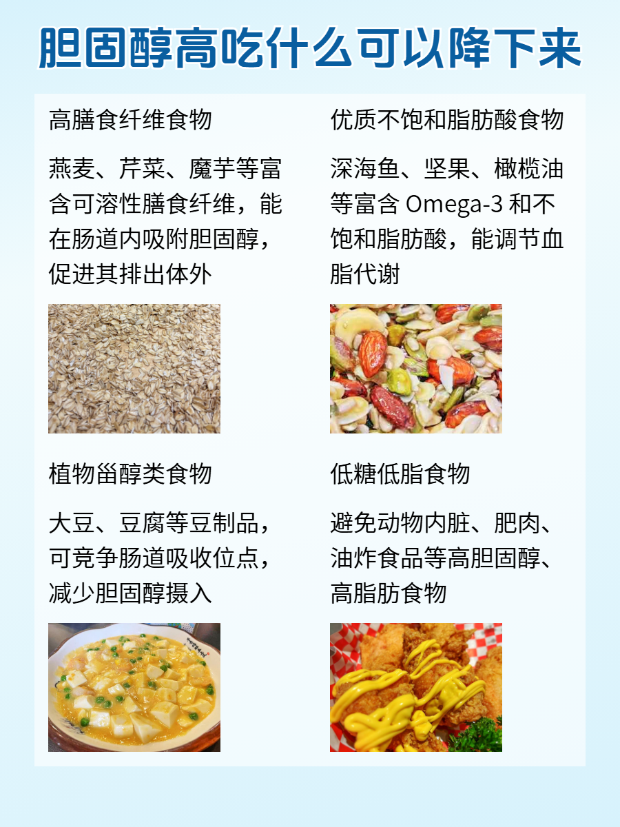 總之,膽固醇高的飲食調理核心是 “高纖維 + 優質脂肪 + 植物甾醇”,通過科學搭配食材、減少有害食物攝入,能有效輔助降低膽固醇,搭配健康生活方式,更利于血管健康維護??。