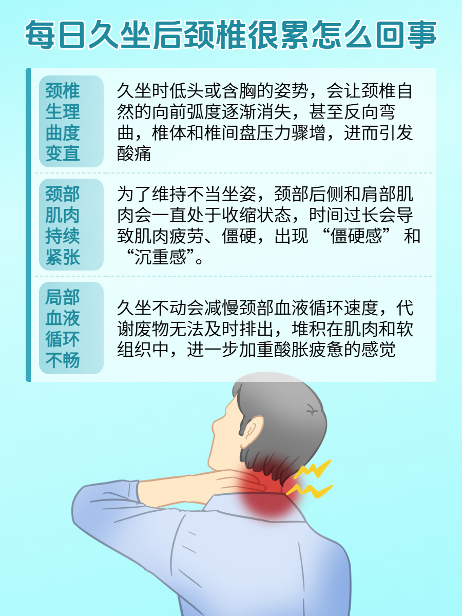 總之,久坐后頸椎累的核心誘因是不良坐姿 + 肌肉持續(xù)緊張,通過調(diào)整坐姿和定時活動,就能有效緩解頸椎不適??