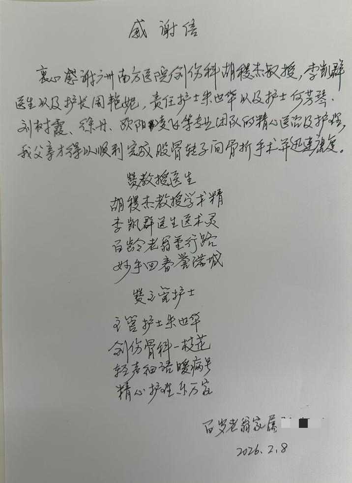 “感謝南方醫院的醫護團隊,讓我父親100歲還能重新站起來!”近日,南方醫科大學南方醫院創傷骨科病房內,百歲老人的家屬手寫一封感謝信送到醫護人員手中,言語間滿是感激。這位100歲患者因股骨轉子間骨折急診入院,在創傷骨科髖關節外科團隊牽頭的老年髖部多學科協作(MDT)診療體系護航下,48小時內完成微創手術并成功下地行走,再次體現了創傷骨科老年髖部骨折規范化治療流程的有效性。