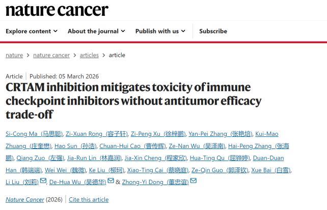 近日,南方醫科大學南方醫院放療科吳德華、劉莉、董忠誼團隊圍繞“免疫治療療效和毒性解耦連”展開研究,相關成果《CRTAM inhibition mitigates toxicity of immune checkpoint inhibitors without antitumor efficacy trade-off》于3月5日發表在《自然癌癥》(Nature Cancer, IF=28.5)上。