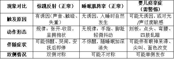 很多家長容易把“驚跳反射”和“抽搐”“缺鈣”搞混。為了方便判斷,我們整理了區分方法,學會區分,既不盲目焦慮,也不錯過真正的異常。